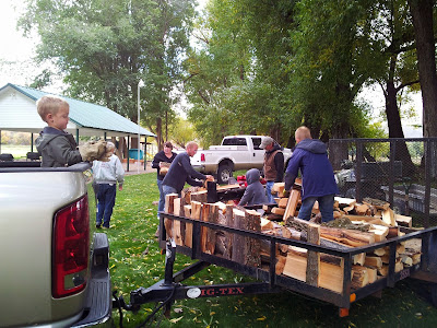 Treyson stacked, Tagg threw to Treyson, Grandpa Roger ran the splitter with his GOOD arm, Zac moved the logs on the splitter, CJ and Grandpa handed Zac the logs...........then in a little while, I took Tagg's job, and he helped Treyson. Thatcher played in the back of the truck.
