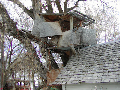 | 1992 - We (Zac and I) built a treehouse down at OUR property (not to be confused with THE PROPERTY). Rog helped a little bit, but it was mostly Zac and I as I remember. It had six platforms, that we placed strategically in a great old tree next to the creek. Those platforms, were actually FORMS that my dad (Grandpa D) had built to form up a headgate for our 13 acres when we put in the new fangled watering system. After the cement dried, and the forms were removed, that is when we repurposed them for the treehouse. In this picture above, there is Zac (almost 11 years old), Jared, Cody, Landon (4 years old), and probably Tom Rich. What fun we had building this, and hanging out down at the creek. If I remember correctly, we even slept down there a few times. Eventually, we abandoned our play area, due to a few different factors. The "city" kids from the nearby subdivisions across the creek, and in Morgan City would come over and trespass and vandalize things. Also, the REAL PROPERTY became available to use (Year 2000), and we started concentrating all of our efforts over there. |